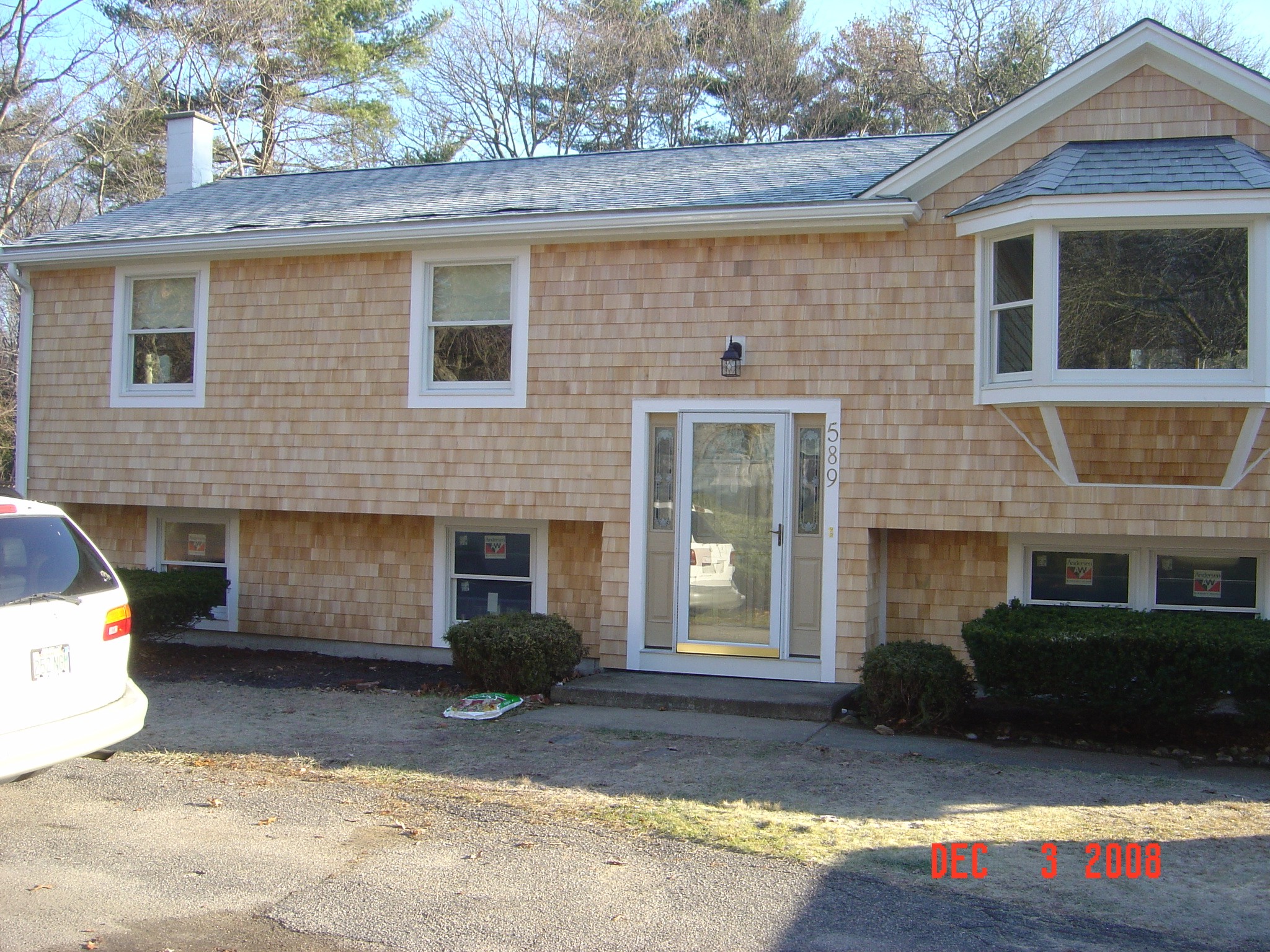 7.20. 2020. Repeat customer. This job is in Duxbury, a complete exterior rip. Existing 2 layers of siding. top layer was cedars nailed to clapboards beneath & the sheathing was fiber board. we are putting Maibec pre finished cedars so the fiber board cannot allow the fastening of the staples so we had to remove the fiber board & then it was realized that this home had poor insulation values. We called Mass save & they were able to help us keep the pricing down.install 1/2" plywood as well. All new pvc exterior trims, rakes, soffits etc. 2 exterior doors & a 6ft. anderson Patio door. sweet. transformed garage entry & home with weaved corners throughout & cedar roof flares.